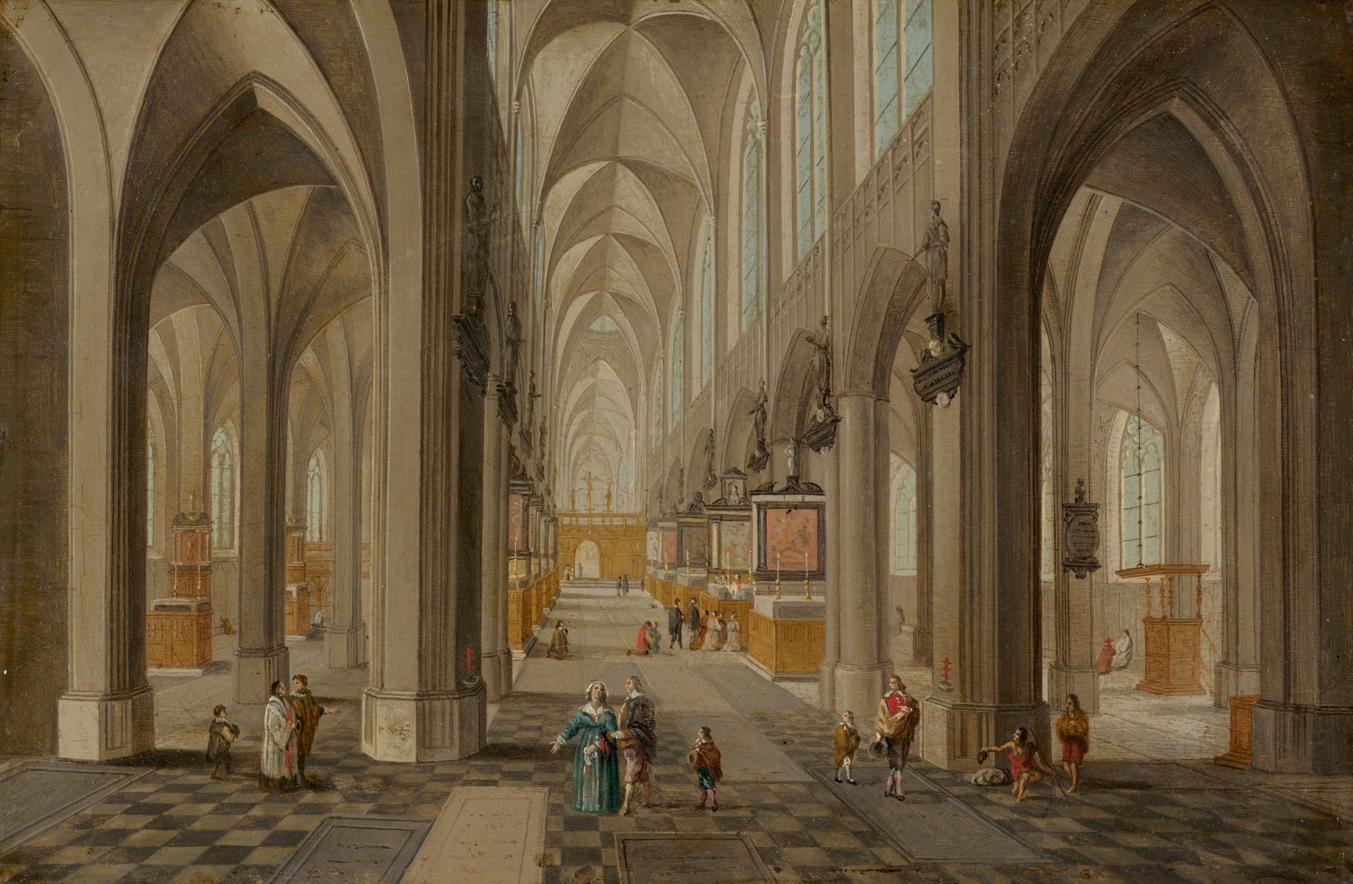 Sunlight filters through soaring Gothic windows, catching on stone ribs and polished tile. Within this vast, echoing nave, time moves slowly. Figures stroll between columns—merchants, noblewomen, altar boys—each absorbed in their own quiet moment beneath heaven’s architecture.