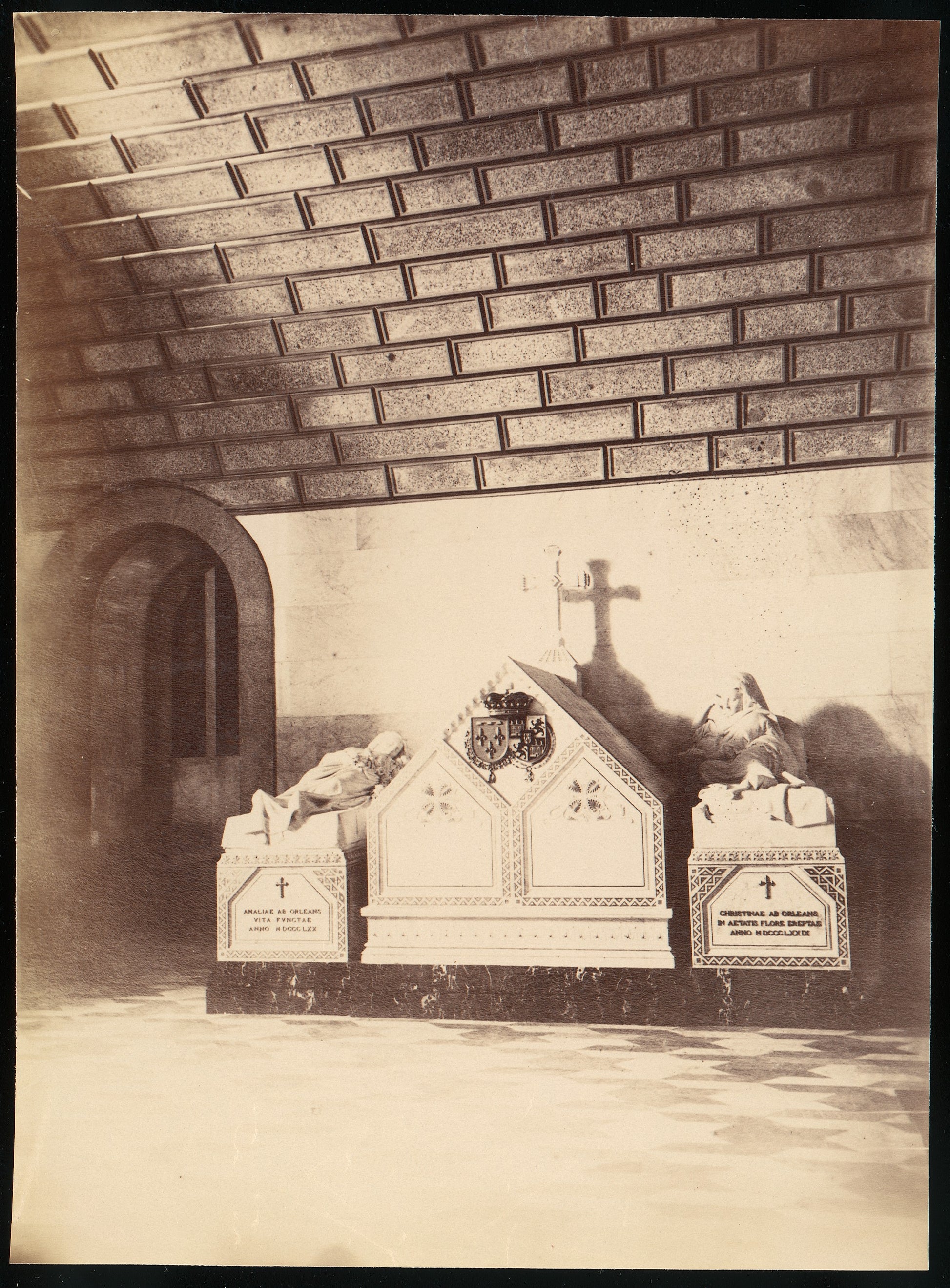 In the solemn stillness of the Escorial Monastery, a powerful narrative unfolds beneath its monumental arches. Captured through the lens of an unnamed 19th-century photographer, the photograph reveals the intricate details of this regal sanctuary: the stoic figure of a marble effigy, the weight of history embodied in the architecture, and the soft shadows that dance across the solemn stone floor. Time seems suspended in this sacred space, where silence reigns and every element speaks of centuries of devotion and power.