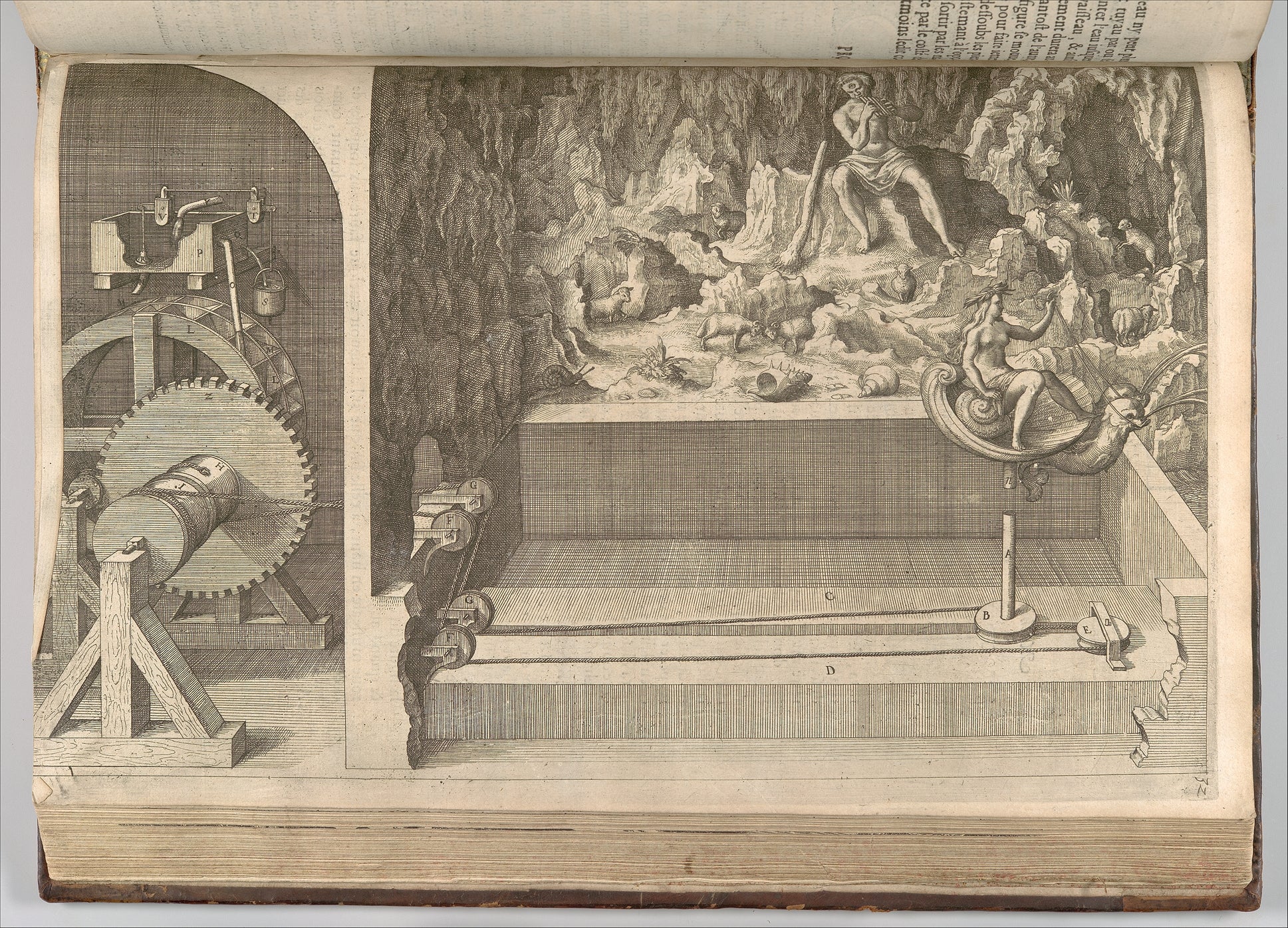 Amid a cloud-wreathed grotto, Galatea glides effortlessly upon a mechanical swan—this is an echo of invention and myth captured in plate. Salomon de Caus’s engineer’s precision meets poetic myth in this engraving: each gear, pulley, and carriage is rendered with crystalline clarity, yet the scene remains alive with theatrical grace. The grotto frames a pastoral dream, where artifice and nature harmonize in silent movement.