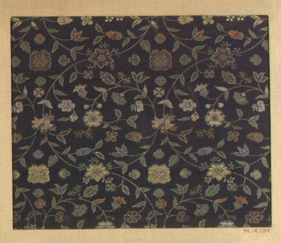 A serene rhythm unfolds across silk threads, where geometry and nature entwine in quiet conversation. In this Edo-period textile fragment, artisans of 18th–19th century Japan wove a world both structured and alive: a honeycomb lattice provides balance, while chrysanthemums unfurl in curling arcs, their petals glowing in shades of coral, gold, and indigo.